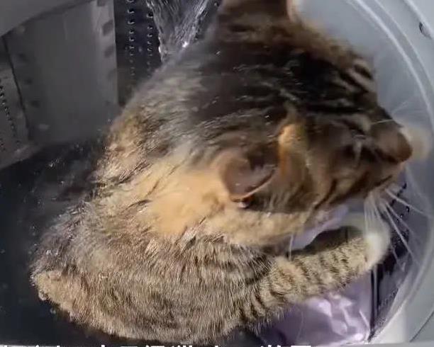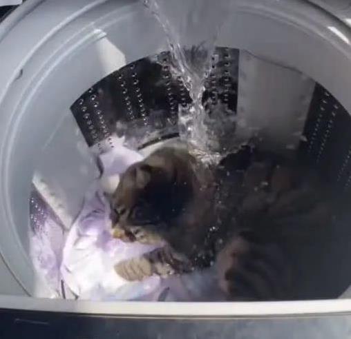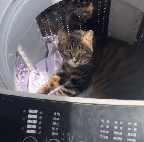 女子打开洗衣机,准备扔衣服进去洗,结果一看,傻眼了!自家猫咪汤姆不知啥时候钻进去,舒舒服服地窝在衣服堆里,像个大爷似的。女子喊它:“快出来,别捣乱!”汤姆却懒洋洋地抬头,圆溜溜的眼睛瞪着她,好像在说:“我就不动,你能拿我咋办?”